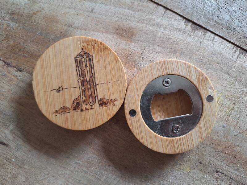 Gebrande flessenopener. Eventueel met opdruk naar keuze! Ze zijn €3,- per stuk.