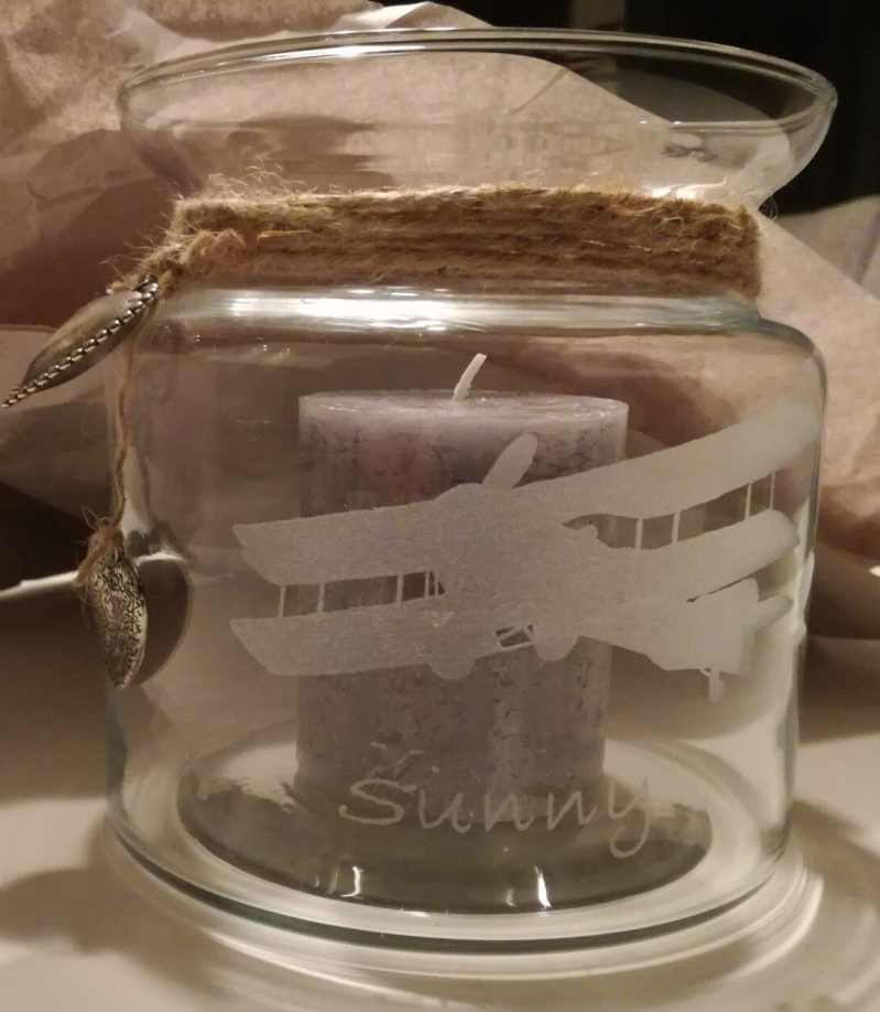 Graveren windlicht met afbeelding naar keuze. Op het voorbeeld is het overlijdenskaartje gebruikt, zodat je thuis altijd een kaarsje op kan steken voor je dierbare.