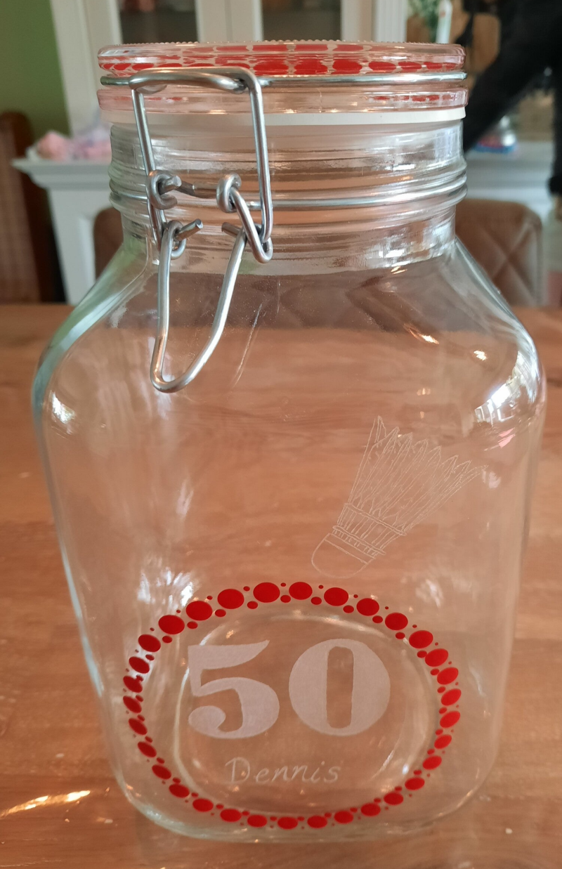 Team cadeautje; allemaal je eigen snoeppot met naam en logo van de club. Vullen met snoepjes en je hebt een cadeau wat in de smaak gaat vallen. Graveren van de kleine potjes is €5,- per stuk.
