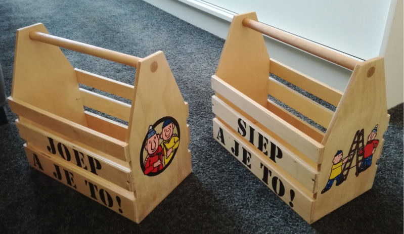 Gereedschapskist met naam van geboren kind, gereedschap, laarzen, bouwhelm en overal met achternaam --> Leuk als kraam cadeau met een groep.